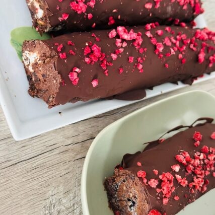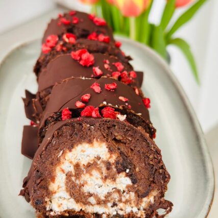 - Če želite jo lahko prelijete s stopljeno čokolado in okrasite z liofiliziranimi malinami.